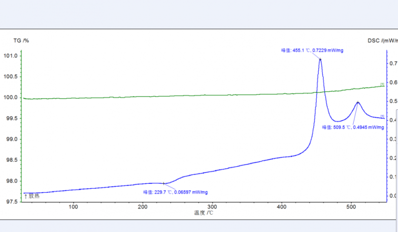 220℃位置是个吸热峰,可能是居里温度吧。仔细看第一张图,在420℃左右,有一个台阶,Tg应该在附近,Tx温度应该到440℃了吧。我是这么认为的。讲得不对,欢迎拍砖。