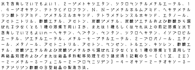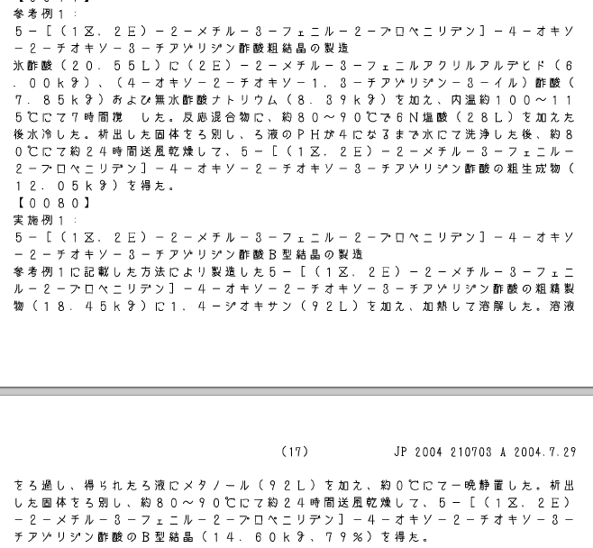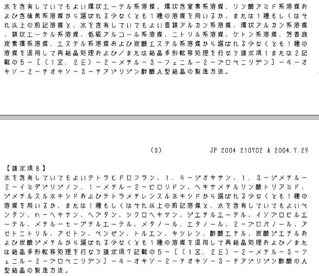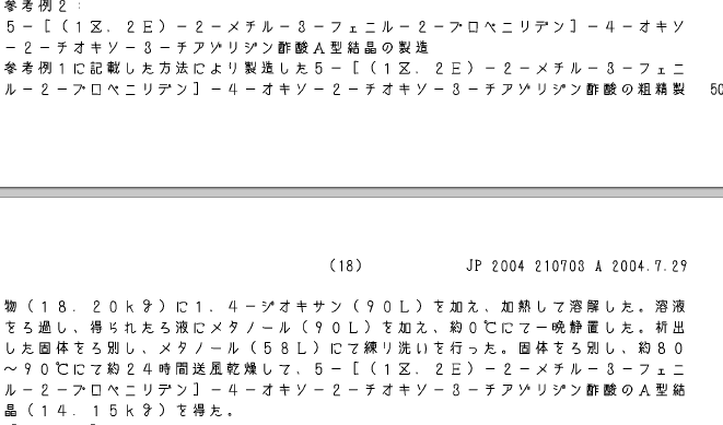 参考例2: 5-[(1Z,2E)-2-甲基-3-苯基-2-亚丙烯基]-4-氧代-2-硫代-3-噻唑烷乙酸A型结晶物的制造 按照参考例1所述方法制造的5-[(1Z,2E)-2-甲基-3-苯基-2-亚丙烯基]-4-氧代-2-硫代-3-噻唑烷乙酸粗品结晶物(18.20kg)当中加进1,4-二恶烷(90L),加热溶解。溶液经过滤得到的滤液中加进甲醇(90L),约0℃中静置过夜。滤出沉淀的固体物,用甲醇(58L)进行炼洗。滤出固体物,约80~90℃中通风干燥约24小时时间,得到5-[(1Z,2E)-2-甲基-3-苯基-2-亚丙烯基]-4-氧代-2-硫代-3-噻唑烷乙酸的A型结晶物(14.15kg)。 参考例1: 5-[(1Z,2E)-2-甲基-3-苯基-2-亚丙烯基]-4-氧代-2-硫代-3-噻唑烷乙酸粗品结晶物的制造 向冰醋酸(20.55L)当中加进(2E)-2-甲基-3-苯基丙烯醛(6.00kg)、(4-氧代-2-硫代-1,3-噻唑-3-基)醋酸(7.85kg)和无水乙酸钠(8.39kg),以约100~115℃内温搅拌7小时的时间。反应混合物当中加进6N盐酸(28L)之后用水冷却。滤出沉淀的固体物,用水洗至滤液的pH值为4后,于约80℃中通风干燥约24小时的时间,得到5-[(1Z,2E)-2-甲基-3-苯基-2-亚丙烯基]-4-氧代-2-硫代-3-噻唑烷乙酸的粗产物(12.05kg)。 实施例1: 5-[(1Z,2E)-2-甲基-3-苯基-2-亚丙烯基]-4-氧代-2-硫代-3-噻唑烷乙酸B型结晶物的制造 按照参考例1所述方法制造的5-[(1Z,2E)-2-甲基-3-苯基-2-亚丙烯基]-4-氧代-2-硫代-3-噻唑烷乙酸粗品结晶物(18.45kg)当中加进1,4-二恶烷(92L),加热溶解。溶液经过滤得到的滤液中加进甲醇(92L),静置过夜。滤出沉淀的固体晶,约80~90℃中通风干燥约24小时时间,得到5-[(1Z,2E)-2-甲基-3-苯基-2-亚丙烯基]-4-氧代-2-硫代-3-噻唑烷乙酸的B型结晶物(14.60kg、79%)。 权利要求1的制造5-[(1Z,2E)-2-甲基-3-苯基-2-亚丙烯基]-4-氧代-2-硫代-3-噻唑烷乙酸的B型结晶物的方法当中使用也可以是含水的乙二醇二甲醚、环戊基甲醚、1,4-二恶烷四氢呋喃、N,N-二甲基甲酰胺、六甲基磷酰胺、二甲基亚砜、四亚甲基亚砜、乙醇乙腈、乙酸乙酯、丙酮、碳酸二甲酯、碳酸二乙酯以及乙酸当中的至少1种溶剂,或者1种或多种上述溶剂与也可以是含水的正己烷、庚烷、戊烷、环己烷、异丙醚、二乙醚、甲基叔丁醚、2-丙醇、乙醇、甲醇、乙腈、丙酮、乙酸乙酯、碳酸二乙酯以及碳酸二甲酯当中的至少1种溶剂混合使用进行重结晶处理及/或结晶多晶型转变处理。 权利要求1或权利要求2所述的5-[(1Z,2E)-2-甲基-3-苯基-2-亚丙烯基]-4-氧代-2-硫代-3-噻唑烷乙酸A型结晶物的制造方法当中,是通过使用从也可以是含水的环状醚类溶剂、环状含氮类溶剂、磷酸酰胺类溶剂和含硫类溶剂当中选出的至少1种溶剂,或者1种或多种上述溶剂与可以是含水的直链烷烃类溶剂、环烷烃类溶剂、链醚类溶剂、低级醇类溶剂、腈类溶剂酮类溶剂、芳族碳环类溶剂、酯类溶剂以及碳酸酯类溶剂当中的至少1种溶剂混合使用,进行重结晶处理及/或结晶多晶型转变处理。 【要求项8】 权利要求7所述的5-[(1Z,2E)-2-甲基-3-苯基-2-亚丙烯基]-4-氧代-2-硫代-3-噻唑烷乙酸A型结晶物的制造方法当中,是通过使用从也可以是含水的四氢呋喃、1,4-二恶烷、1,3-二甲基-2-咪唑啉酮、1-甲基-2-吡咯烷酮、六甲基磷酰胺、二甲基亚砜和四亚甲基亚砜当中的至少1种溶剂,或者1种或多种上述溶剂与也可以是含水的戊烷、正己烷、庚烷、环己烷、二乙醚、异丙醚、甲基叔丁基醚、甲醇、乙醇、2-丙醇、乙腈、丙酮、苯、甲苯、二甲苯、乙酸乙酯、碳酸二乙酯和碳酸二甲酯当中的至少1种溶剂混合使用进行重结晶处理及/或结晶多晶型处理。 |