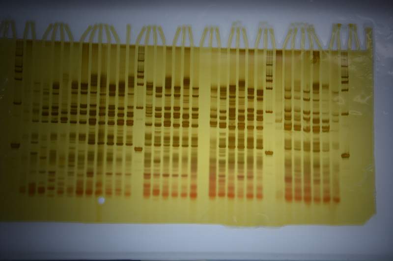 看你的电泳条带很宽,颜色很深,建议减少点样量,同时减少银染和显影时间