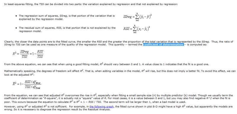 我这里有原始数据X,经过非线性拟合函数(lsqcurvefit)得到拟合值Y,现在想用MATLAB自己算出决定系数R^2,网上翻阅了计算公式算出来R^2的值都超过了1,不清楚网上给出的公式对不对,麻烦下哪个大神把公式列出下,多谢了 R平方值=回归平方和(ssreg)/总平方和(sstotal) |