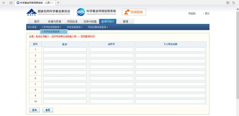 1.登录ISISN 2.新开窗口输入 https://isisn.nsfc.gov.cn/egrant ... itch_role?j_role=20 3.如下图输入姓名和身份证号查询(不能输姓名和单位查询) 说明:role=20,是学校管理人员标志。只要点”管理“看一下就知道了。 该法能查到以前所有项目,今年的不知能否查到,已知结果的牛人们可以验证一下。 Snap2.jpg |