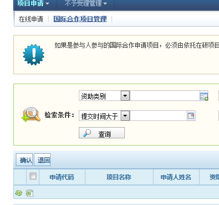 在国际合作管理页面,和查询与统计页面。我印象里 以前没有吧。大家是以前就有,还是现在有了,或者现在也没有。 我以前中过青基,在国际合作那里打开execl后,显示的是一个空表格,只有栏目,没有内容。在查询与统计页面打开那个excel后,里面只有自己以前的项目。。。。 国际合作项目管理页面.png OX{V{GBU}2B164ASLFIMEYO.png |