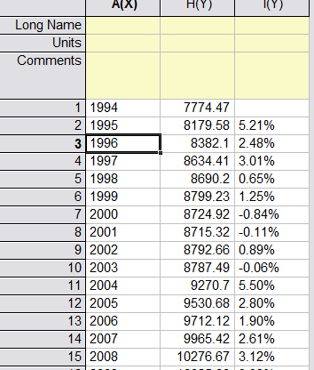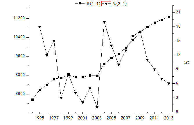 | 求组各位origin大神,画双Y轴图,我的横坐标是年份,左边纵坐标是数量,右边是环比增速,为什么右边的坐标轴刻度与数据对不上呢?谢谢,麻烦解决,本人是初学者 |