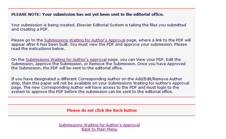 第一次投稿这个期刊,没什么经验。在填完投稿前面所有的内容后,提交了文档,等待转换成PDF出现了这个界面。 然后等了一会儿见没有什么反应,点击了提示的第一个链接,出现了这个界面: 再后来看到提示,略感到绝望,然后再点击到主界面,空空如也就和没投过一样…… ![]() 要等多久才能出现PDF啊?还是我哪一步操作错误了? 另外这个期刊一定需要用cover letter吗? 望各位大神帮忙啊~~ |