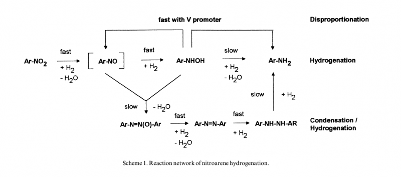1,第一条路线(从硝基—亚硝—羟胺—苯胺)是主反应,第二条路线(氧化偶氮—偶氮—氢化偶氮—苯胺)是副反应。因为一旦形成偶氮类化合物,很难最终转化为终产物苯胺(在正常反应条件下)。(个人观点) 2,对于第一条路线,从成建角度考虑,O=N=O(NO2)加氢后到N=O(O=NH-OH不稳定,可直接脱水生成N=O?)、N=O加氢到NH-OH,都是加成反应,而NH-OH变NH2是脱羟基反应,直观感觉加成比脱羟基更容易一些。加入V可降低羟胺量,应该是加速了脱羟基反应吧。 3,至于“硝基苯(亚硝?)和羟基苯胺聚合成氧化偶氮苯”,我们希望越slow越好,巴不得不发生呢。 |