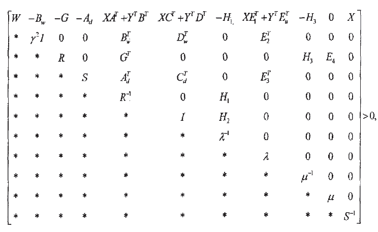 最近看文献,出现了一个如图所示的矩阵不等式,W,X,Y,R都是未知矩阵,第五行第五列上的矩阵块是R的逆, 而它所在的列的第一个矩阵块中有X和Y, 这样的话,如果在不等式的两边同时左乘再右乘blog(I,I,I,R,I,I,I,I,I,I)还是画不成LMI, 请问各位XDJM,该怎么将这个化为LMI?非常感谢, ![]() ![]() (附:作者在文中说形式上虽然不是LMI,但是很容易将其化为没有LMI,就是没有说明到底怎么化 ![]() ![]() )NEG9]ZU1IZSXW$_IH@IOXUX.png [ Last edited by feixiaolin on 2015-8-25 at 13:33 ] |