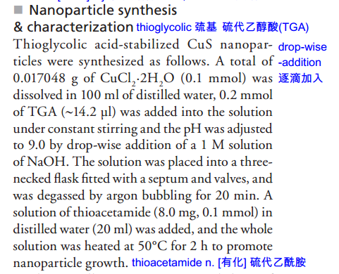 最近在做水相的硫化铜纳米粒,得到的溶液是绿色,电镜下显示团聚的很厉害。不知道有没有哪位同人做过二氧化硅包覆硫化铜的实验,硫化铜被包覆后颜色会改变吗?看的一篇文献中颜色只是变淡,另外自己用的是CTAC,对于这个模板剂,需要在什么环境下会更容易包覆?再有就是本身硫化铜是在50度下合成的,如果包覆实验温度升高会不会对硫化铜粒子有影响? 合成方法(2010年).png |