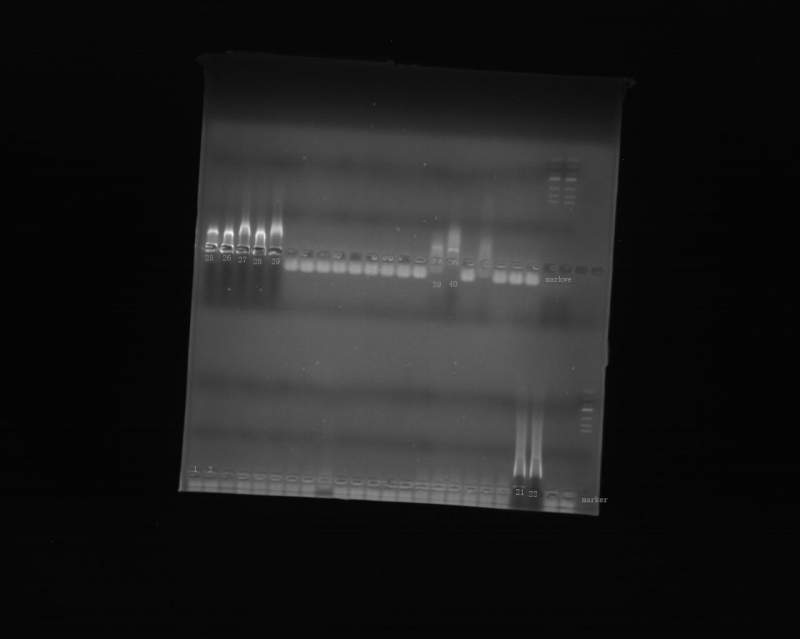 自己用裂解液裂解支原体培养液的沉淀物,定性是否提取到DNA,做了电泳(1.5%浓度的琼脂),图如下: 个人见解:21、22:是否DNA降解? 25、26、27、28、29:蛋白未除尽,有DNA条带(半月形)? 39、40:DNA降解,有DNA条带? 其他反向是什么意思? 2015-8-27-1.jpg |