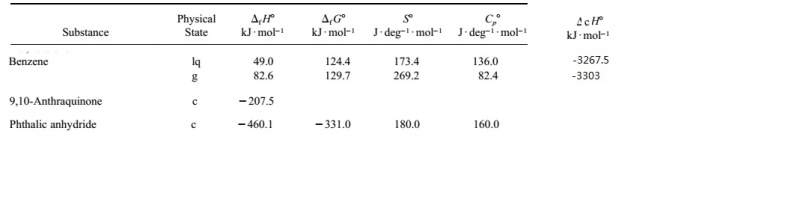 | 有知道苯、苯酐、蒽醌的标准摩尔生成焓、标准摩尔燃烧焓、标准摩尔定压热容的数据的吗,谢谢 |