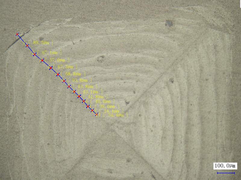 给各向同性热解石墨材料做维氏压痕试验,当载荷达到400N时候,压痕内部开始出现裂纹,不是那种沿着压痕直径扩展的那种(帕氏裂纹)。随着载荷的增大,裂纹增多,但是当实验做到1800N的时候,材料还是完好无损,没有压溃。试验后,测得的硬度HV值大概是55左右。不知道这种裂纹产生的原因是什么?如何解释,用什么方法解释这种现象? 700N扩展.jpg 1100N及间距.jpg |