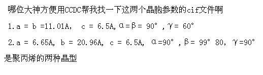 哪位大神方便用CCDC帮我找一下这两个晶胞参数的cif文件啊 1.a = b =11.01A, c = 6.5A,α=β= 90°,γ= 60° 2.a = 6.65A, b = 20.96A, c = 6.5A, α=90°,β= 99°80,γ=90° 是聚丙烯的两种晶型 360截图20150829095119406.jpg |