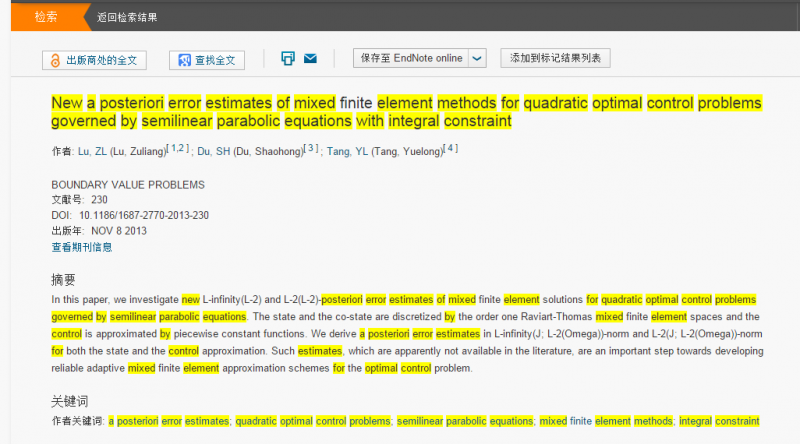 | Zuliang Lu, Shaohong Du, Yuelong Tang. New a posteriori error estimates of mixed finite element methods for quadratic optimal control problems governed by semilinear parabolic equations with integral constraint, Boundary Value Problems,2013, 230, pp. 1-21 (SCI期刊,IDS:V38KV) |