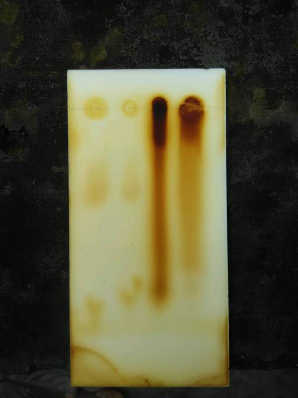 最近,开始做乳酸薄层层析鉴定乳酸类型,试过丁酸乙酯:乙酸=2:1,碘熏蒸,层析板没有任何斑点,对照也没有。前两天又试了正丁醇:乙酸:水=17:3:1,碘熏蒸,图片如下(左到右依次是:L-乳酸、DL-乳酸、样品1、样品2).感觉还是分不开,我想请教各位大神,有做过乳酸薄层层析的指点一下,用什么展开剂比较好,展开时间多长?谢谢 IMG_20150831_094258.jpg |