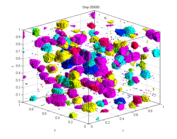 各位好: 下面是我用fortran语言编写蒙特卡罗算法计算的液相烧结的结果,图像是我用matlab绘制一个个面后显示的效果,觉得计算慢且效果不好,先求有什么软件可以用来漂亮地显示我的结果。数据结构:格子类型,每个晶体由挨在一起的具有相同编号许多小格子组成。谢谢! mc250000.png |