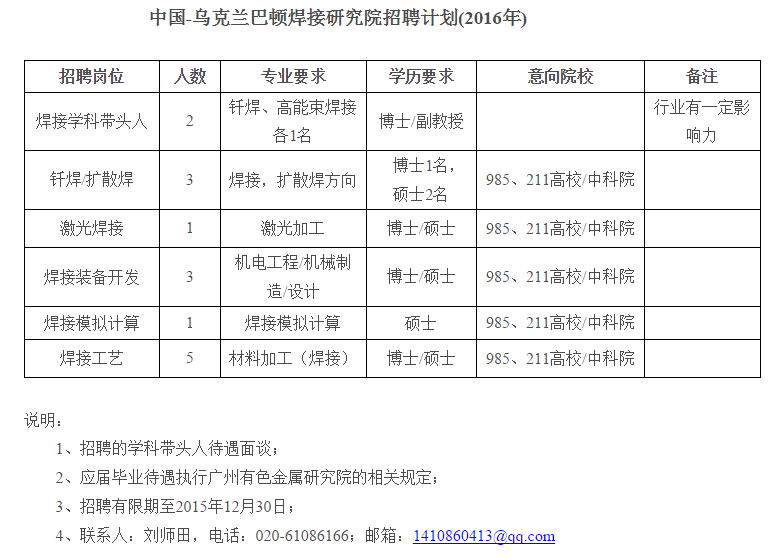 中国-乌克兰巴顿焊接研究院招聘计划(2016年)(需求人数:15)