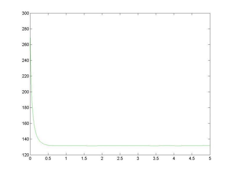直接用命令就行啦! > f=inline('(-0.000004*y^4 - 7*y + 2124)/5','t','y') f = Inline function: f(t,y) = (-0.000004*y^4 - 7*y + 2124)/5 >> [t,y]=ode23(f,[0 5],300);plot(t,y,'r-') ode.jpg |