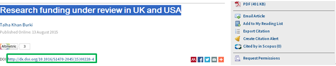 Science、Nature、JAMA、Cell、NEJM和The Lancet等相关期刊的免费下载方法 大家经常去的文章搜索网站是PubMed,找到感兴趣的文章之后,发现是收费的,无法进行下载,只能继续查找相关文献,下面介绍三种文章免费下载方法。为了说明相关的问题,我们先以Science网站上搜索到的文章进行举例说明,然后在具体的针对一些高等级的期刊进行个别介绍。 一、 方法一 下面介绍的这种方法适合《Science》、《Nature》、《JAMA》、《Cell》等杂志,每个杂志又略微有点不同。以《Science》杂志的文章下载进行说明, 第一步:在《Science》杂志的首页文章搜索栏,键入“Breast Cancer” 第二步:找到感兴趣的相关文章 第三步:点击“Full Text”链接,进入文章页面 第四步:找到文章页面所对应的网站地址 第五步:在网址中“org”的后面键入“.sci-hub.org” 第六步:键入回车键,进入下载页面 其它期刊杂志的文献下载方法: 在《Nature》杂志网站的首页搜索栏,键入“Breast Cancer”之后,直接点击相关的文章链接,进入到文章的下载页面。在文章页面的浏览器地址栏的“com”后面加上“.sci-hub.org”,然后键入回车键,即可进行文章免费下载。 《JAMA》、《NEJM》杂志的文章下载方法与《Nature》杂志文章下载方法的一样 《cell》杂志的文章下载方法与《Science》杂志文章下载方法的一样 二、 方法二 《The Lancet》杂志的文章下载不能通过方法一下载到,需要通过第二种方法才能下载到。例如,在杂志的首页搜索框中键入“Breast Cancer”之后,会出现很多搜索结果,具体如下操作: 第一步:键入“Breast Cancer” 第二步:找到感兴趣的相关文章 第三步:点击“Full-Text HTML”链接,进入文章下载页面 现在我们看一下文章的下载链接 此时如果没有账号和密码是无法进行下载的,同时在网址的“com”后面键入“.sci-hub.org”也是无效的。下面需要进行我们的第四步。 第四步:找到文章的“Doi”链接(第三步的绿色框),并将其复制。 第五步:在链接的“org”后面键入“.sci-hub.org”,敲回车键即可进行下载。 该期刊的下载比较特殊,如果《The Lancet》已经发刊,根据Doi号可以找到全文,如果只是在网上先刊出,文章虽然已经有了Doi编号,但是其Doi编号暂时无法进行链接,需要再等一段时间。 三、 方法三 其实,大家最开始查找外文文献是从PubMed数据库开始的。在电脑卡或者网速低的情况下,我们会考虑尽可能的少打开网页,或者想直接链接到文章的下载页面。下面介绍一下比较简单快捷的方法,以PubMed数据库进行说明,但是该方法不能保证所有的文献都能下载到。 第一步:键入“Breast Cancer” 第二步:找到感兴趣的相关文章 第三步:找到文章的Doi编号 第四步:将文章的Doi编号转入“http://dx.doi.org/”链接的后面 第五步:在新链接的“org”后面键入“.sci-hub.org”,敲回车键即可进行下载。 由于PubMed数据库中收录的杂志种类较多,这三种方法不能满足所有的期刊文献下载。PubMed数据库中有些杂志上的文献本来就是免费下载的,但是PubMed数据没有通过“Free Article”标示出来,如果用这三种方法,反而下载不到文章。不管按照哪种方法,万变不离其宗——.sci-hub.org。 另外,本方法只是在生物医学领域类的一些杂志进行了尝试,而其他类的杂志没有尝试,还需要大家多努力。 本方法仅作为娱乐之用,请勿用于商业用于,如果需要文章,还请联系相关期刊杂志。 |