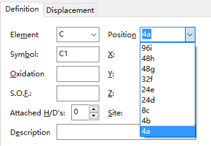 数字表示multiplicity of the site position 字母是Wyckoff letter Wyckoff letters are assigned to site positions starting with “a” for the site with the lowest multiplicity and the highest symmetry. |