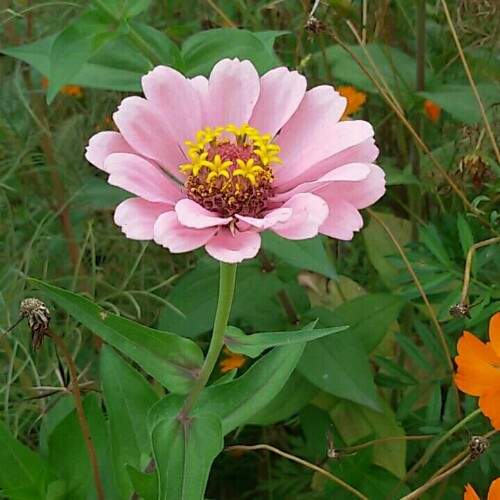 就是百日草 百日菊(学名:Zinnia elegans Jacq.):一年生草本。茎直立,高30-100厘米,被糙毛或长硬毛。叶宽卵圆形或长圆状椭圆形,两面粗糙,下面被密的短糙毛,基出三脉。头状花序单生枝端,总苞宽钟状;总苞片多层,宽卵形或卵状椭圆形。舌状花深红色、玫瑰色、紫堇色或白色,舌片倒卵圆形,先端2-3齿裂或全缘,上面被短毛,下面被长柔毛。管状花黄色或橙色,先端裂片卵状披针形,上面被黄褐色密茸毛。雌花瘦果倒卵圆形,管状花瘦果倒卵状楔形。花期6-9月,果期7-10月 |