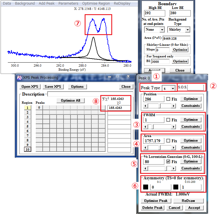 如题,XPSPEAK分峰软件刚开始使用,看了些资料,对分峰原理操作有了些了解了,现在分峰时软件操作不太懂,附图,请大神指导下。 1,图中①,② 请说明如何选择?特别是S.O.S请详细说明 2,③,④,⑤,⑥处的数值是不是在使曲线一致的前提任意组合输入? 3,⑦处是C1s的峰,可能在空气中污染了。被污染的C1s可以用于论文写作吗? 4,⑧处代表什么意思? xpa 分析求解.png |