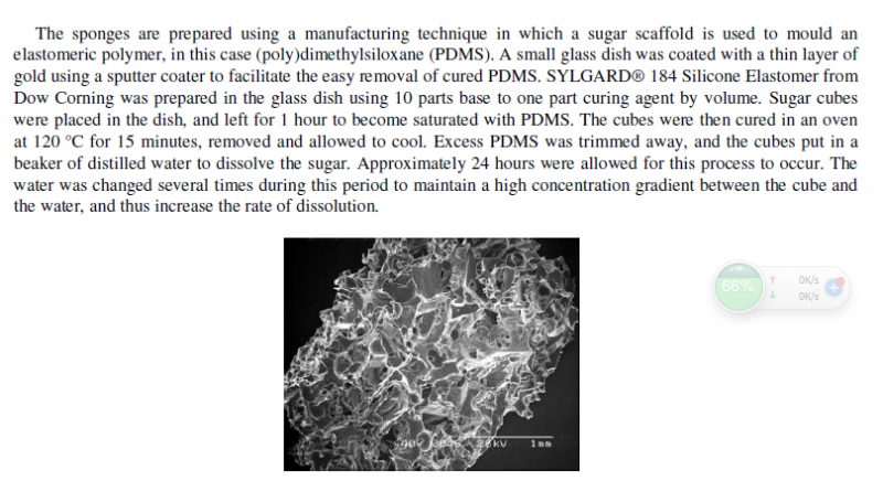 文章中的制作步骤是这样的:The sponges are prepared using a manufacturing technique in which a sugar scaffold is used to mould an elastomeric polymer, in this case (poly)dimethylsiloxane (PDMS). A small glass dish was coated with a thin layer of gold using a sputter coater to facilitate the easy removal of cured PDMS. SYLGARD® 184 Silicone Elastomer from Dow Corning was prepared in the glass dish using 10 parts base to one part curing agent by volume. Sugar cubes were placed in the dish, and left for 1 hour to become saturated with PDMS. The cubes were then cured in an oven at 120 °C for 15 minutes, removed and allowed to cool. Excess PDMS was trimmed away, and the cubes put in a beaker of distilled water to dissolve the sugar. Approximately 24 hours were allowed for this process to occur. The water was changed several times during this period to maintain a high concentration gradient between the cube and the water, and thus increase the rate of dissolution. 大概意思是:将方糖和PDMS混合在一起,待PDMS固化以后,再将方糖溶解,形成多孔的PDMS,但是具体操作好像很难,所以希望哪位高手指点一下 |