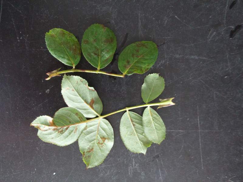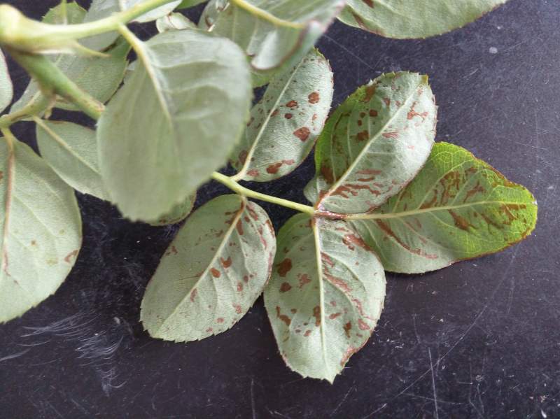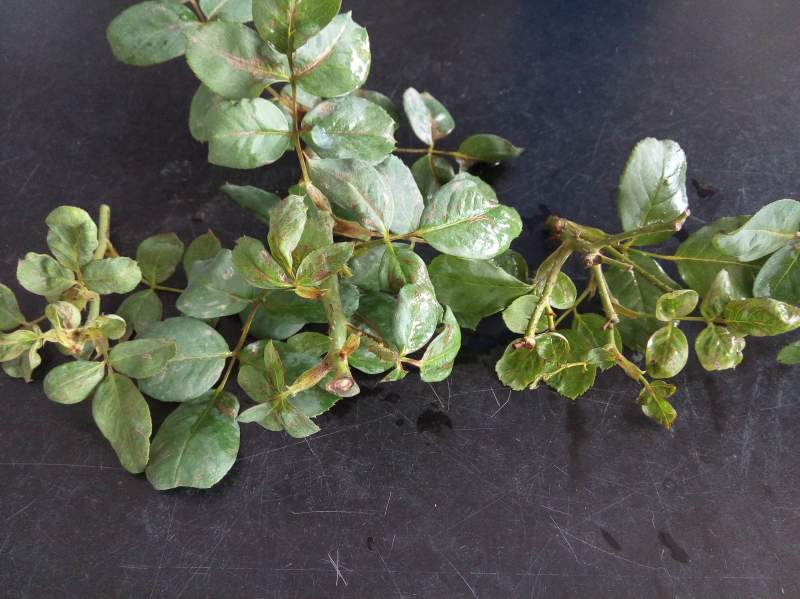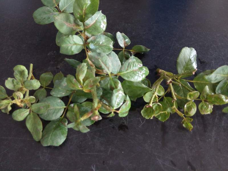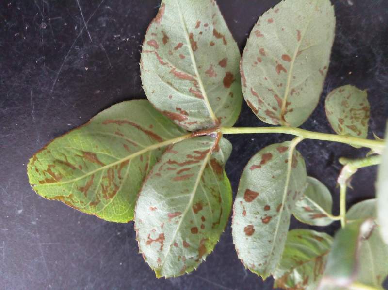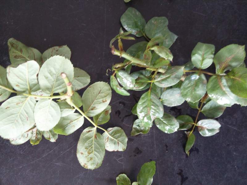 月季霜霉病 初期下部叶片背面出现退绿病斑,且病斑不规则,并布满霜状霉层; 后期呈暗紫色,似水浸状,直至变成褐色。 病斑呈多角形,逐渐变成灼烧状,危害严重时叶片全部脱落,植株死亡。 http://baike.baidu.com/view/4944864.htm |