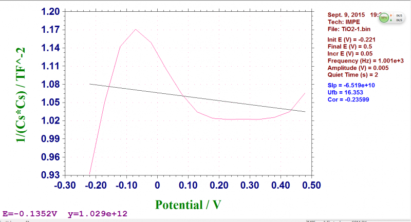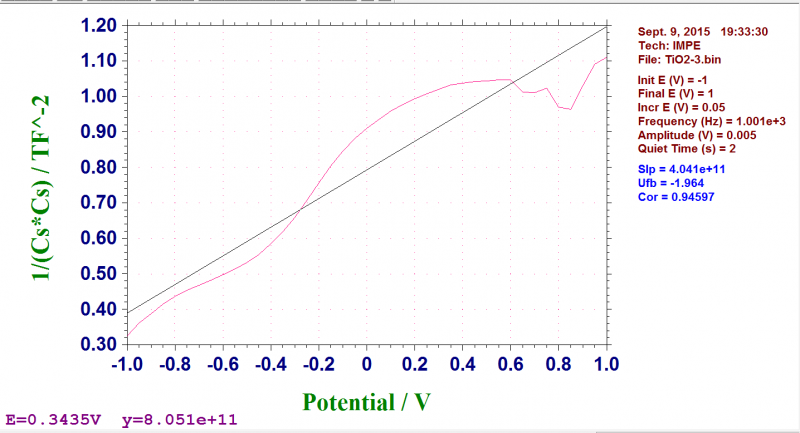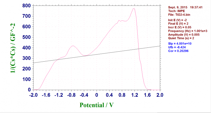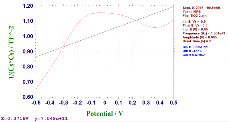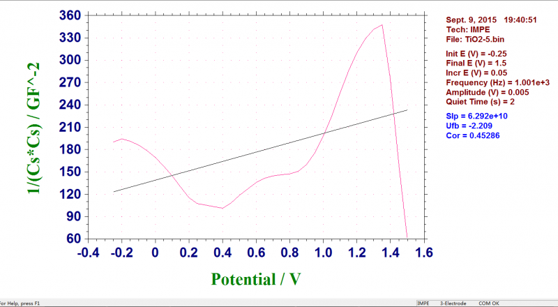 电解质溶液是PH=14NaOH,工作电极是:5%nafion溶液做粘合剂,异丙醇和水为溶剂,加入二氧化钛粉末混合,滴加在玻碳电极上 下面是我做的几张MOtt-Schottky 曲线,仅仅是测量范围变化了,其他参数条件都一样,是依次测量,麻烦大神平带电位呀。。。 ![]() ![]() ![]() TiO2-1.png TiO2-2.png TiO2-3.png TiO2-4.png TiO2-5.png |