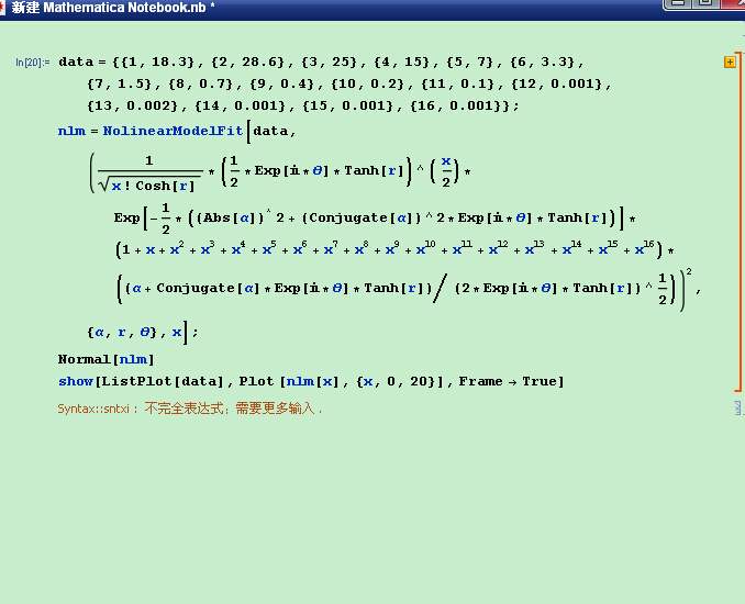 最近想用Mathematica软件对一组数据最小二乘法曲线拟合问题,以下是数据及代码,错误提示“不完全的表达”,修改了多次,还是一直提示这种错误,没辙了。 哪位大神帮忙看看到底哪里出错了? 万分感谢!!! mathematica数据拟合代码.jpg |