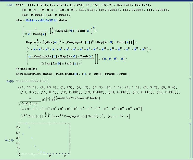 阿尔法和西塔的取值可能是复数?但是你用于拟合的原始数据又全是实的?这个模型真的没有问题吗? 如果真的没有问题,那么: 1. 这大概又是模型本身的强非线性导致的拟合失败,可能需要精心寻找合适的初值,关于这个你仔细看看FindFit(NonlinearModelFit其实是这个函数的壳儿)的自带帮助的“可能存在的问题“一节。 2. 如果我没记错的话FindFit等一系列拟合函数实际上是默认拟合参数在实数域,所以如果你的参数是复数的话就需要把实部和虚部分开设。关于这个可以参看这个帖子:http://mathematica.stackexchange.com/a/43237/1871,里面有高手已经写了一个针对复数域拟合的程序包,你可以试试看。 不过,我稍微试了一下,不给初值的情况下拟合效果依旧欠佳,恐怕你这模型还是要找到合理的初值才有救。至于什么初值合适,我想你这个模型创造者肯定比我清楚。 |