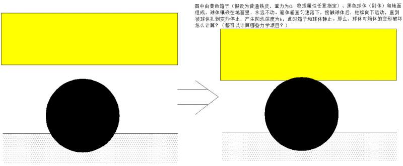 图中由黄色箱子(假设为普通铁皮,重力为G,物理属性任意指定)、黑色球体(刚体)和地面组成,球体镶嵌在地面里,永远不动。箱体垂直匀速落下,接触球体后,继续向下运动,直到被球体扎到变形停止,产生凹坑深度为h,此时箱子和球体静止。那么,球体对箱体的变形破坏怎么计算?(都可以计算哪些力学项目?) 接触变形.jpg |