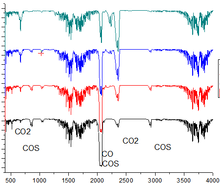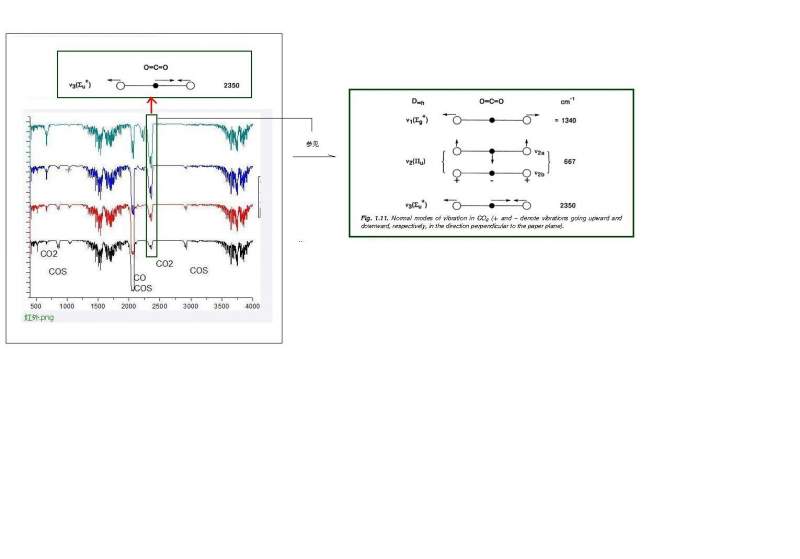 我做了一个气体的红外,确定有的物质是CO、CO2、SO2、COS,得到下面的谱图,用色谱能够检测出前面4中物质,没有清晰的SO2的峰,不知道2250左右的峰是什么物质,请行家看看我的分析是否正确,未知的峰是什么物质,谢谢。 金币比较少,就请不吝赐教了 红外.png |