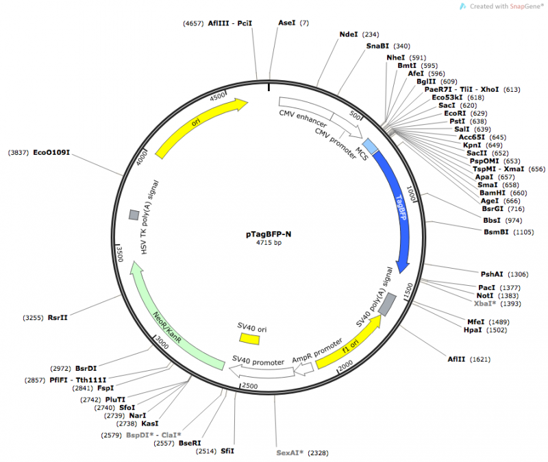 发现实验室有pTagBFP-N这个质粒,就想用它作为载体来构建克隆,因为它带有荧光蛋白,但是不知道它的全序列,不方便设计引物进行菌液PCR筛选,实验室的好像没人用过这个质粒,上网查了很久,只找到这个质粒的图谱,哪位好心人有这个质粒的序列,或者能不能帮我找找它的序列,在此万分感谢!这个质粒图谱如下: pTagBFP-N_1x.png |