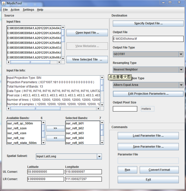 要处理MODIS数据产品MOD09A1 范围是中国区域 下了十五景的影像 用MRT转换投影并拼接时参数是这么设置的 但是结果显示不正常 并且原始HDF反射率数据DN值都是零点几 处理完之后变成几百到一千多 请有经验的人士指点 十分感谢! QQ截图20150912111149.png QQ截图20150912111123.png |