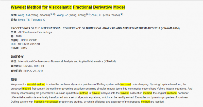 论文标题 Wavelet method for viscoelastic fractional derivative model 作者:Xiaomin Wanga, Jizeng Wang, Youhe Zhou 会议名称:international conference on numercial analysis and applied mathematics (ICNAAM) 时间:sep 22-28,2014 |