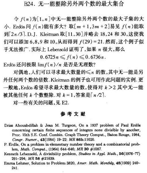 关于《数论中未解决的问题》一书中的问题B24(见下图):![]() 有人评述:“Erdos的B24问题是一个有趣的组合数论问题,问题的本质是讨论给定区间或范围内的素数分布问题,因而给定范围内的两两互素的整数序列的构造与此区间内互不相同的素数个数是密切相关。” 该评述如何理解?请教于诸位大侠。 渴求较详细地说明。 谢谢! 1.jpg |
