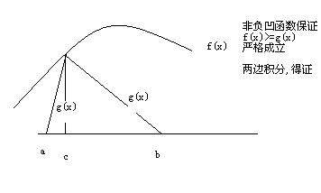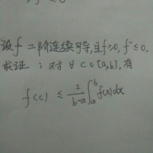 由于f(x)二阶可导且恒不大于零,因此 f(x)在一定存在最大值M、最小值m以及平均值p=Integral{f(x)*dx,a,b}。并且取得平均值的位置点至少有两个。假设x=q是与取得最小值的点x=r相邻的取平均值的点,则在q与r之间必然存 ...