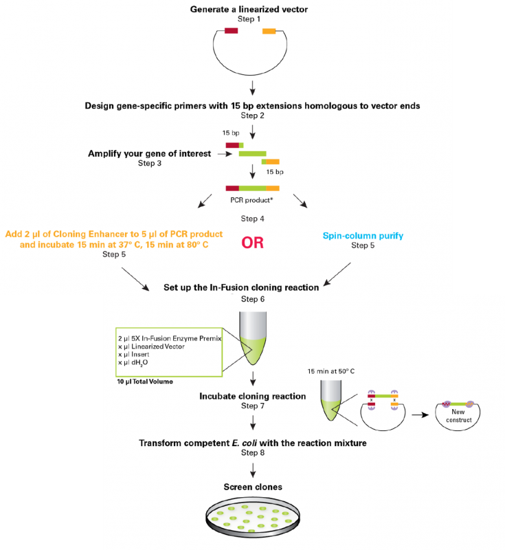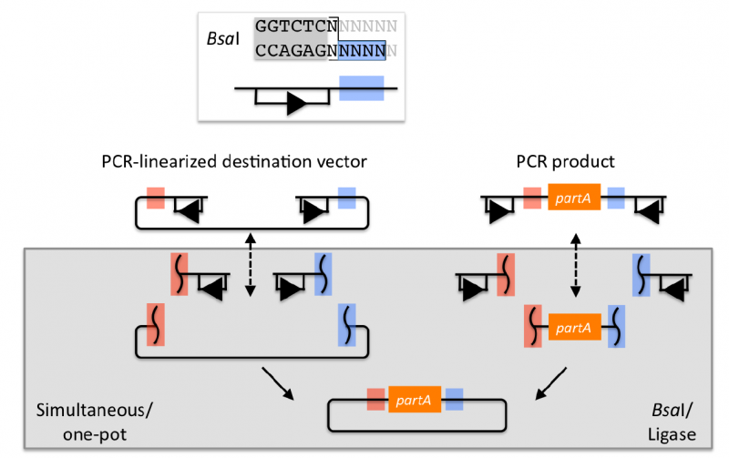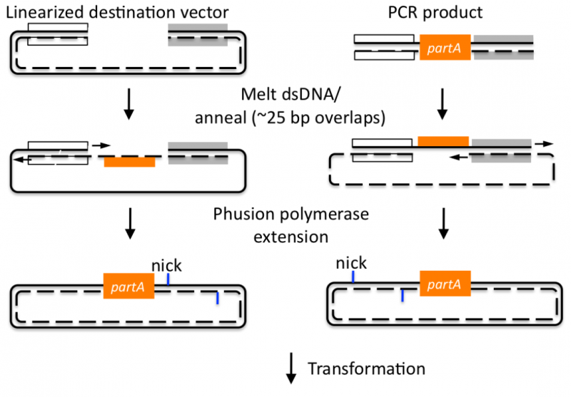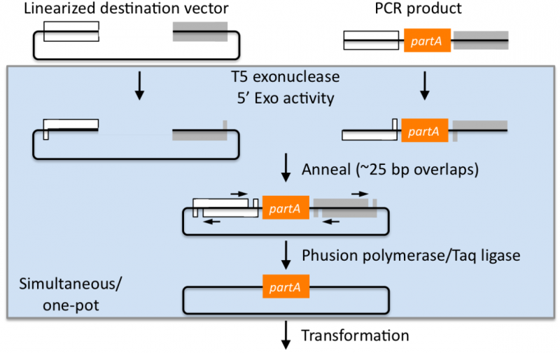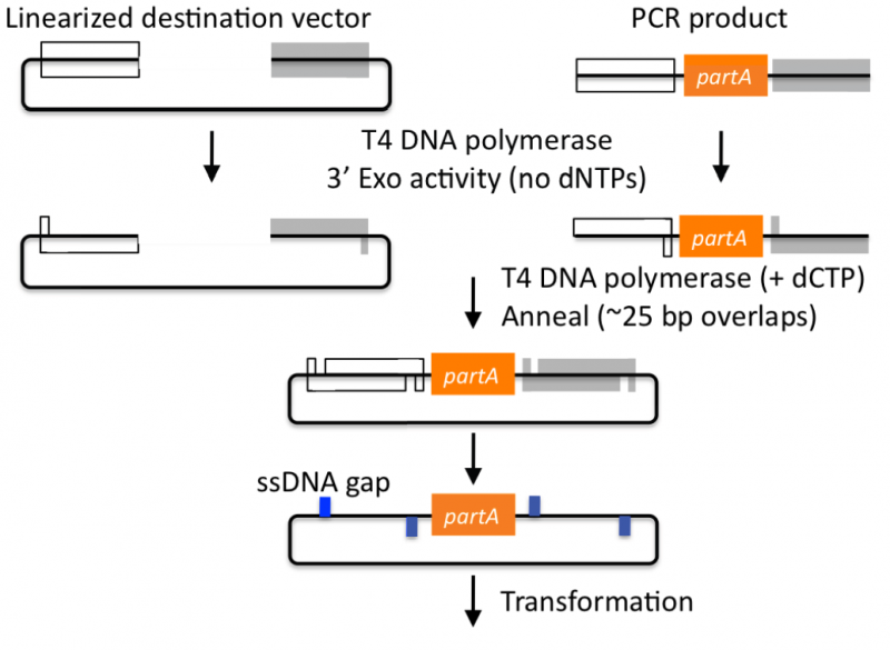 合成生物学的主旨就是模块化生物组件如DNA序列、蛋白功能组等等。然而到现在为止,科学家们可以普遍模块化的生物组件也只有DNA序列而已,在未来更多模块化的蛋白质组件甚至代谢分路组件肯定会被设计出来,届时合成生物学必将更为吸引人。在合成生物学的应用中,我们既要有模块化的DNA序列,也要有高效地拼接方法,那么DNA剪辑拼接技术就显得至关重要。拼接技术主要分两大类:以剪切酶为基础的拼接(enzyme-based assembly)和以序列互补重组为基础的拼接(recombination-based assembly)。 1、以剪切酶为基础的拼接(enzyme-based assembly) 这个就是最基础的使用限制性内切酶区产生特定的单链DNA接口,同样的酶产生的缺口是可以重新拼接在一起的。这就是最传统的序列编辑方法。酶切重组在本文就不多做详解,本文将会重点描述互补重组的拼接技术。 2、和以序列互补重组为基础的拼接(recombination-based assembly) 2.1 SOE & CPEC Splice by overlap extension (同时也叫splice overlap, SOE) 和circular polymerase extensioncloning (CPEC) 两种方法的原理相同。SOE连接的是两段DNA片段,而CPEC连接的是DNA片段和一段线性化的质粒。CPEC原理如下图:基本反应原理是PCR,但是要插入的DNA片段和质粒片段互为PCR引物,当过了一个“失活-粘接-延伸”的循环后,完整的环状质粒就可以形成,但会留下两个缺口(nicks)。就这样如图partA片段就和质粒片段拼接在一起了,全过程只需要DNA聚合酶的参与。在CPEC开始之前,要保证part A前后两端的序列分别和质粒两端的序列一致,如图白和灰框所示。完成导入后,裂缝缺口会被细胞修复。 2.2 SLIC Sequence and ligase independent cloning直译为不依靠序列位点和连接酶的分子克隆。SLIC的特点是利用T4 DNA聚合酶(T4 polymerase)的3`核苷水解功能,在不存在dNTPs(脱氧核苷酸三磷酸)的情况下。同样,插入片段和质粒片段要在首尾两端设置相同序列。 当反应液中不存在dNTP的时候,T4聚合酶会表现出3`核苷水解特性,所以双链DNA会从3`开始被水解,变成单链DNA。SLIC图第二步中加入dCTP (胞嘧啶脱氧核苷酸三磷酸),T4聚合酶的3`核苷水解功能会被阻止,聚合酶的功能又会重现。那么此时,插入片段partA的两端白/灰框所指示的序列和质粒的白/灰框序列是互补的,就会自动连粘。 SLIC图第三步中,T4开始发挥作用,补缺不齐的序列,留下四个缺口。在完成转入后,空缺部分会被补缺。 2.3 Gibson Gibson组装命名于它的发明者。相当于升级版的SLIC。整个过程中使用三种酶T5 5`外核酸水解酶,DNA聚合酶和TaqDNA连接酶。不像SLIC需要分步加入材料,Gibson组装可以将所有反应物放在一起,实现一步反应(one-pot reaction)。以小编的经验来看,Gibson组装的同源序列的长度要超过40 bp,而且插入DNA序列的长度要超过250 bp,这样的反应成功率会高一些。过短的序列,一般直接被水解成单链,很难组装连粘。 2.4 In-Fusion In-Fusion可以算得上是升级版的Gibson组装,和Gibson组装的原理基本一致。市面上也专门有In-Fusion kit卖。它的优点是只需要15 bp长度的同源重合序列就可以完成组装。小编自己也没有用过,所以和Gibson组装比起来,优劣难说。 2.5 GoldenGate GoldenGate连接法是酶切和同源组装的一个结合。它利用BsaI酶切位点的特性,设计同源互补序列。同样,GoldenGate也是一步到位的反应,特别适用于多片段重组。BsaI是一个识别12个碱基序列的限制性内切酶,十二个位点中有六个是固定的,其余六个是随机的。利用这一特点,可以灵活设计随机的六个位点。如GoldenGate图所示,红框和蓝框所指示的序列都属于BsaI的识别位点,但他们并不相同,那么就保证了,DNA片段以正确的方向插入到质粒当中去。除了上文中提到的这些序列组装方法外,还有SLiCE,USER,GeneArt等等方法,有兴趣的同学可以自行查看。每个方法各有利弊,在以后的文章中,小编可能会对比不同方法的使用细节和优劣。 文章来自"BioEngX生化工程实验室" http://mp.weixin.qq.com/s?__biz= ... e615dd6d528893e4#rd CPEC原理.png SLIC.png Gibson.png In-Fusion.png GoldenGate.png |