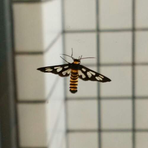 | 鹿蛾,鹿蛾科(Amatidae)小至中等大蛾类,外形似斑蛾或黄蜂。喙发达,但有时退化,下唇须短而平伸,长而向下弯或向上翻,头小,触角丝状或双栉伏。胸足胫节距短,腹部常具斑点或带。翅面常缺鳞片,形成透明窗;前翅矛形、颇窄,翅顶稍圆,中室为翅长一半多;后翅显著小于前翅。幼虫色泽鲜艳,具有4对腹足、1对臀足,体表常具毛瘤,其上着生长毛簇,腹足趾钩半环形;蛹光滑、坚硬、有茧。在花丛中飞翔吮吸,休息时翅张开,因为鹿蛾体钝,加上后翅很小,飞翔力弱,人们常可用手去捕捉它们。 |