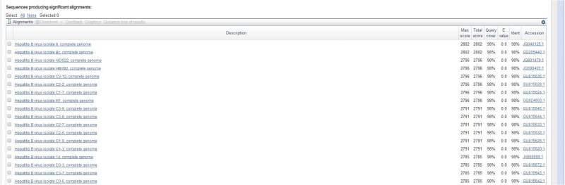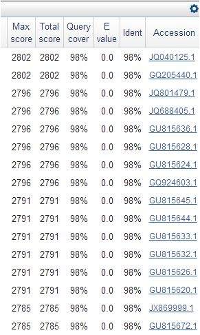 我之前做实验提取了一段核酸PCR后,把PCR结果送到公司测序,测序完成的结果用NCBI上的blast进行了序列比对,结果如下面的图表示。 我的问题是怎么看哪条序列与我提供的同源性比较高,怎么看,可不可以判断分型? 由于第一张图看不清楚,上传了后面2张,第二张图是第一张的左侧结果,第三张图是第一张的右侧结果 序列比对.jpg 序列比对.jpg 序列比对.jpg |