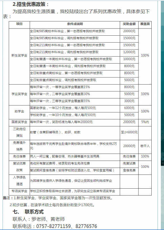 2016年佛山科学技术学院(佛山大学)硕士招生优惠政策: (1)新生奖学金: 全日制985高校本科毕业,第一志愿报考我校并被录取20000元; 全日制985高校本科毕业,调剂报考我校并被录取15000元; 全日制211高校本科毕业,第一志愿报考我校并被录取15000元;全日制211高校本科毕业,调剂报考我校并被录取12000元; 全日制普通一本高校本科毕业,第一志愿报考我校并被录取10000元; 全日制普通一本高校本科毕业,调剂报考我校并被录取8000元; 全日制非重点高校毕业,第一志愿报考我校并被录取8000元; 全日制非重点高校毕业,调剂报考我校并被录取5000元。 (2)学业奖学金 每年评审一次,一等学业奖学金覆盖面15%,8000元;每年评审一次,二等学业奖学金覆盖面30%,5000元;每年评审一次,三等学业奖学金覆盖面55%,3000元。 (3)助学金 国家助学金,一年12个月发放,每人每月500元;学校助学金,一年10个月发放,每人每月500元。 (4)国家奖学金 每年评审一次,奖励标准为每人每年20000元。 (5)三助岗位津贴 助管(含兼职辅导员)、助研、助教,至少6000元。 (6)免费境外培养 每年选拔若干优秀学生赴境外高校联合培养半年,学校支持2万元。 (7)免住宿费 住宿费全免(两人一间公寓,配空调、热水器等基本生活用具)。 (8)复试优惠政策 免收所有复试费用,被录取的考生免体检费;复试期间食宿免费(安排学校附近酒店入住、学校食堂用餐);被录取的考生,学校按照火车卧铺标准报销往返车票。 (9)入学绿色通道 为困难学生提供入学绿色通道,保证让贫困生顺利完成学业。 (10)专项奖学金 学校正积极争取各种社会资源,为研究生设立各类专项奖学金 备注:1.新生奖学金、学业奖学金、国家奖学金等为一次性足额发放。 2.初步估算,在读学术硕士每月各类补助至少1700元。 |