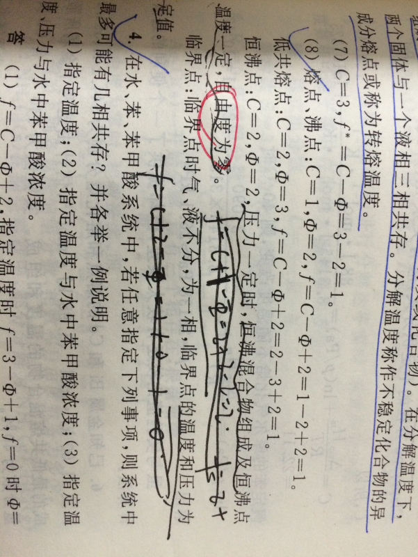 熔点: f=1+2-2=1(温度与压力间遵循克拉贝龙方程) 低共熔点:f=2+2-3=1 (低共熔点的温度随压力变化而变化) 沸点:f=1+-2-2=1 (温度与压力间遵循克劳修斯-克拉贝龙方程) 恒沸点:f=2+2-2-1=1(特殊点,有一特殊条件,气相组成等于液相组成) 临界点:f=2+2-2-1=1(特殊点,有一特殊条件,气相组成等于液相组成) |