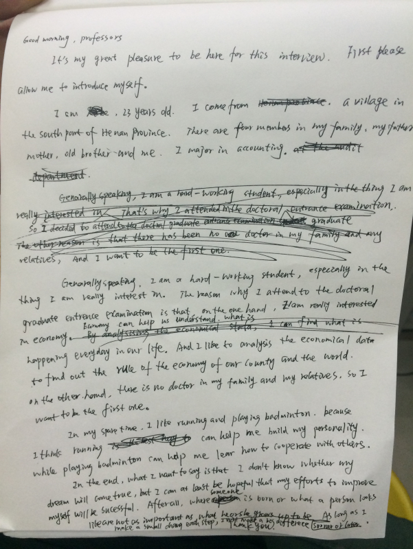 帮你改写了, 请笑纳 Thank you all for being here I appreciate this opportunity to introduce myself in person I'm 23 I come from a typical nuclear family in rural China My college major is accounting I'm trying to be the first in my whole extended family to earn a PhD, and to do so in a subject that's always been near and dear to my heart China's planned economy has been on a meteoric rise all my adult life Every time China's 7% annual GDP growth is headline news, I'm there reading between the lines, checking economic data, walking the streets to find out the truth for myself I enjoy walking, and even more so running and playing badminton Running builds character Badminton make me a better team player on and off the court I'm living proof that success depends more on perseverance than one's looks or family background My country folk sensibility for the Chinese and world economies has already made me a better accountant Please consider admitting me so I would have an opportunity to share my skill and world view I thank you all sincerely |