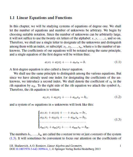 Linear Algebra and Geometry Authors: Igor R. Shafarevich, Alexey O. Remizov ISBN: 978-3-642-30993-9 (Print) 978-3-642-30994-6 (Online) |