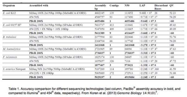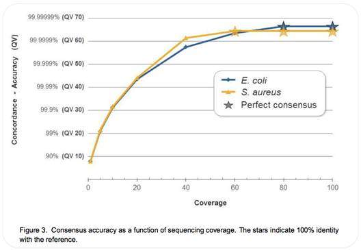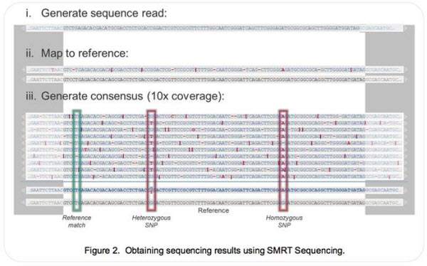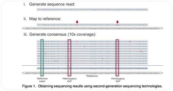 第三代测序中的PacBio单分子实时(Single Molecule Real-Time, SMRT)DNA测序可以实现超过99.999%(QV50)的高度精确测序,且不受DNA序列中GC和AT含量的影响,平均读长可达10-15kb(最长>40kb),这是如何实现的呢?这是因为SMRT技术在与DNA测序精确度相关的三个方面均有独到之处: 1. Consensus accuracy(一致性准确性) 2. Sequence context bias(测序偏好性) 3. Mappability of sequence reads(测序reads的map表现) 本文将从专业客观的角度从这三方面详细阐述SMRT测序技术的表现,图文并茂,数据详实,请各位看官留步,细细品味。 1. Consensus accuracy(一致性准确性) 一个典型的测序过程通常包括三个基本步骤:(i)生成测序reads,(ii)将生成的reads mapping到已知的参考序列上,(iii)为了得到最终的序列而生成consensus。如果DNA样本是未知起源的,那么第(ii)步就会被de novo基因组组装所代替,以便生成一个新的参考基因组。最后一步是将原始测序reads mapping到assembly结果。 为了使大家更好的理解SMRT测序技术是怎样达到准确度>99.999%的,图1我们先来review一下在second-generation sequencing系统中,测序结果是怎样得到的。 在这个例子中,一条120bp的read被mapping到参考基因组上,红色箭头表示与参考基因组不一致的碱基。但是我们不能单凭这一条read的mapping结果就给出生物学结论,因为我们不知道这种不一致究竟来自于真正的生物学变异还是仅仅是由于测序错误导致的。同样,单凭一条read也无法call出heterozygous SNPs,因为在这种变异里,我们至少需要来自父方和母方染色体的各一条read。因此,要想获得真实准确的生物学发现,必须通过将多条reads进行averaging,然后与参考基因组的相同区域进行map,换句话说,需要进行building consensus。 在这个例子中,来自于10条reads的average序列信息(相当于10?#65289;被用于判断与参考位置究竟是match,还是homozygous SNPs,亦或是heterozygous SNPs。那么,同样的策略其实也被用于SMRT测序技术中(见图2)。 2015042816390007.jpg 2015042816391873.jpg SMRT测序可以产生更长的reads(平均读长可达10-15kb,最长>40kb),但是为了与图1一致,便于理解,我们在图2还是只看120bp的长度。虽然在SMRT技术中,single-pass reads更容易出错(平均错误率11%),这些错误主要由于deletions(水平红线)和insertions(垂直红线)引起。考虑到SMRT-sequencing reads的这些特征,Pacific Biosciences公司开发了名为BLASR1的mapping工具,专门为mapping SMRT-sequencing reads进行了优化。尽管单次读取(single-pass)的错误率稍高,但是使用BLASR还是可以准确的将SMRT-sequencing reads mapping到参考序列的相应位置。因此,正如图1中二代测序的例子一样,无论哪种采用技术,没有人会关注一个碱基只被测一次的结果,最终结果都是经过consensus分析之后得到的,比如,当做到10?#30340;时候,每个位置的序列信息就是由10次读取之后产生的平均结果而定(如图中垂直的框)。所以,对于PacBio三代测序来说,针对每一个碱基,10次读取中有9次都是正确的,足够让我们判断出该位置的正确信息。 根据SMRT-sequencing reads的这一特点,PacBio公司也开发了一个名为Quiver的consensus工具,可以生成高质量的consensus序列(www.pacbiodevnet.com/Quiver)。 然而,如果测序方法本身存在系统错误,无论consensus之后的序列是不是正确,测序结果都将会受到影响。也就是说,如果某个碱基被系统地读错,那么在consensus之后它也仍然是错的,且这一错误是无法通过增加coverage克服的。而SMRT测序技术的consensus准确率之所以能够>99.999%,最关键的一点就是由于single-pass的错误是随机错误,这意味着随着coverage的增加,这种随机错误可以很快被消减掉。这点已经有多篇publications进行了理论及实践验证2,3。图3说明了SMRT测序的准确度与coverage之间的关系,星号代表与reference达到100%一致。 2015042816394028.jpg 为了判断准确度是否能达到QV50或以上,需要把consensus序列与已知的精准的参考序列相比较(例如已有金标准参考序列的物种)。可以采用某些已被Sanger测序广泛测过的细菌基因组作为标准,如E.coli和S.aureus。该图表明了虽然SMRT-sequencing reads的单次读取的准确性比其他方法略低,但是一旦增加coverage,准确率就可以快速提升,很多情况下可以实现完美的参考基因组。我们可以从Table 1看到,SMRT测序的准确性甚至可以达到>QV60,也就是1百万个碱基里面只发生1个碱基错误。 SMRT Sequencing的consensus准确率可以超越其他测序方法,就是因为它是随机错误。这也是很多研究都采用SMRT Sequencing来验证基于其他平台发现的SNPs的根本原因2,4-Table 1中高亮显示的就是consensus之后的准确性。在该例中,对于任何测序平台来说,有意义的也都是consensus结果,而非单次读取的结果。 2015042816400362.jpg 图4是关于SNP验证的代表性的例子,直接用SMRT测序数据验证Illumina测序平台产生的SNP call,清楚表明了SMRT测序准确识别生物学变异的能力。 未完待续 |