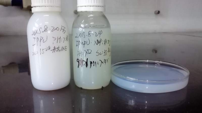 水性聚氨酯合成后颜色为淡灰色,但取其一滴入水则为淡蓝色半透明状及扩链剂量的问题