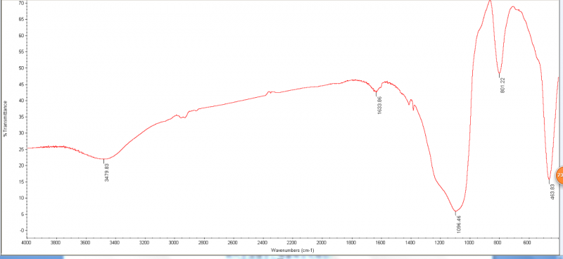 我觉得:3500和1630是水的吸收峰,1100、800和460都是二氧化硅和水的吸收峰。1400附近的两个峰我不知道是什么。所以我看不出来有。...