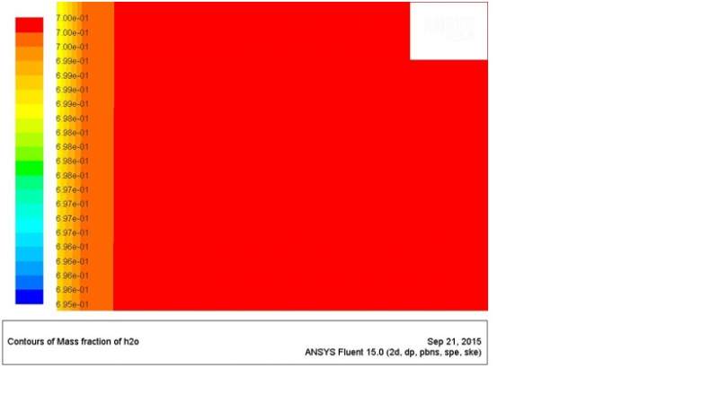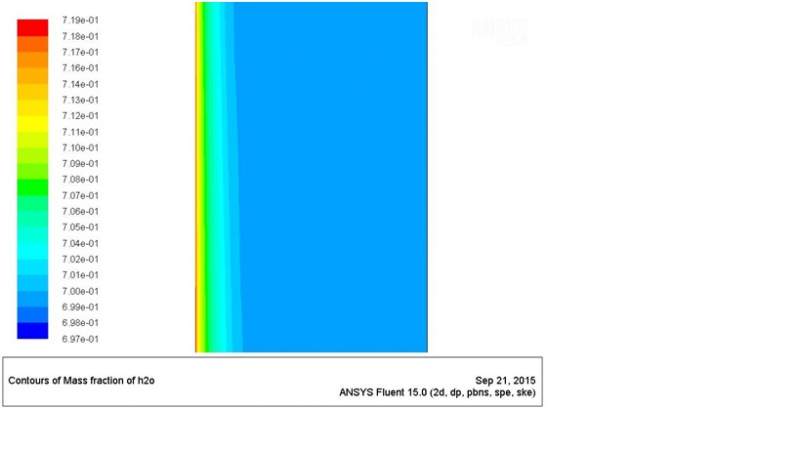 关于这个程序,有一点说明,论文中公式后面几个是计算质量分数的,但是,udf能够存储水蒸汽质量分数,为什么论文中还多此一举去求质量分数?这是我的一点疑问,于是我这里就直接获得求解器的质量分数,并且获得了质量分数的梯度,这样问题就来了,在这个区域只有一层网格,获得质量分数没问题,但是这个质量分数梯度的获得有没有问题,按理说质量分数的梯度至少是两个网格单元做的差分,一层网格获得梯度貌似存在问题。这个程序写完我导入FLUENT进行计算,就出现问题了,在残差收敛后,我监控了进出口的质量流量,发现这个源项产生的作用几乎为0,进出口完全持平,于是我为了排除是不是源项太小产生的误差直接把质量源项部分改写成-0.4,得到非常显著的进出口流量差异。以下两个图就是UDF源项和constant-0.4源项所产生的水蒸气质量分数分布云图:
