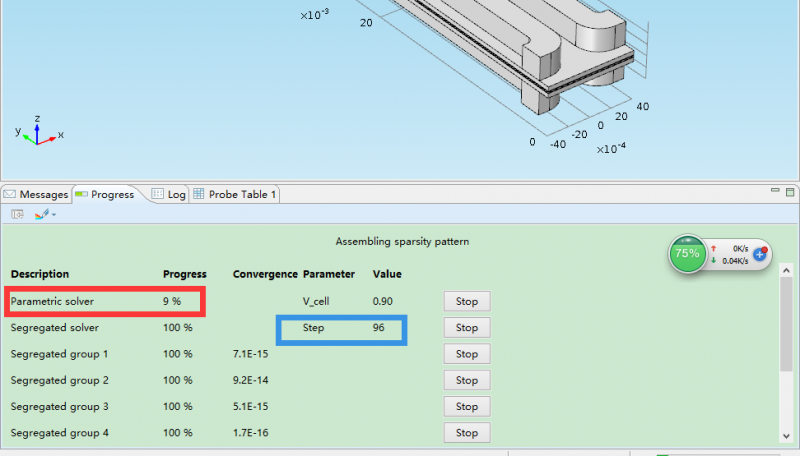 计算过程中出现这种情况:红色线框内计算进程始终保持在9%,而蓝色线框内的值在缓慢增加。请问这是什么原因?此时的计算还在进行吗?还是说程序已经算不到结果了?还是有别的情况。
