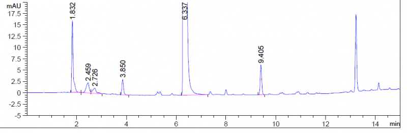 最近在做用2-氨基吡啶合成咪唑并吡啶类药物中间体,在水解酸化过程中遇到一些问题,HPLC显示在1.8min、和2.4min处有一个较大的杂质峰,采用反相柱,应该是记性很强的东西,但不清楚是什么原因造成的,忘各位大神多多指导,希望将此处的峰减弱。水解酸化过程的反应和色谱图见附件,谢谢啦!![]() 水解.jpg RT2I8NIE`39FPE7ZH7B@YZP.png |