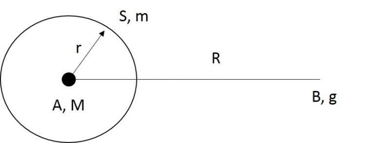 化学硕士出身,在自学广义相对论,各位高手帮忙解答一个问题。 假设在一个球的球心A处有一个质量为M的质点,球面上均匀分布着质量为m的电磁波,问球外一点B处的重力加速度g是多少?已知球的半径为r,AB之间的距离为R. 我知道用万有引力计算的话应该是g=G(m+M)/R2,请问用广义相对论怎么计算? 图片3.jpg |